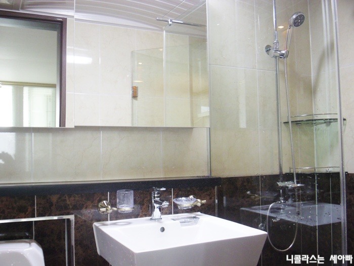 우선 욕실구조가 휠씬 고급스럽고, 반다리형 세면기를 설치할 수 있고,