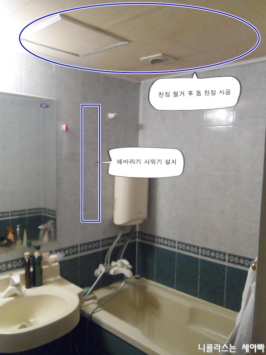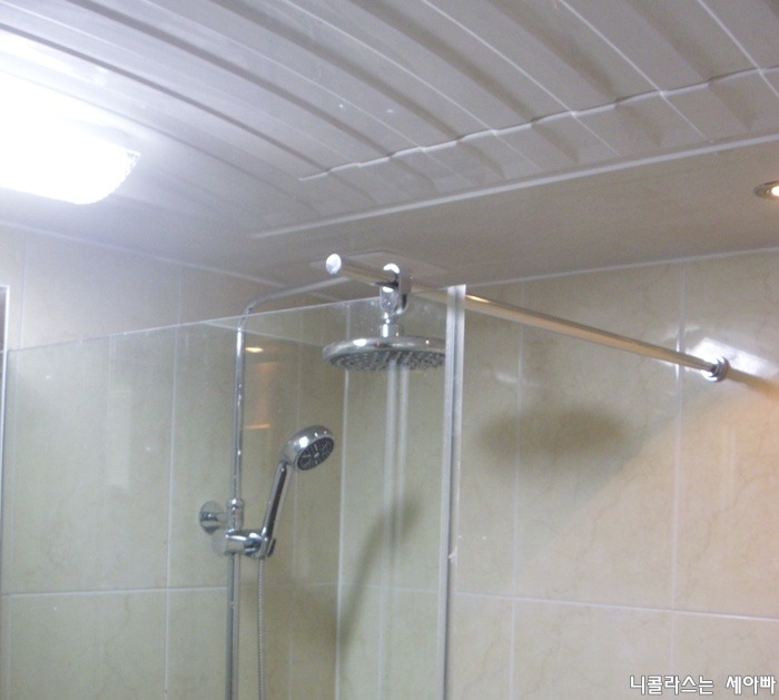 해바라기 샤워기는 최대한 천정 쪽으로 올려 시공하면 좋습니다. 요즘은 키들이 큰편이라....