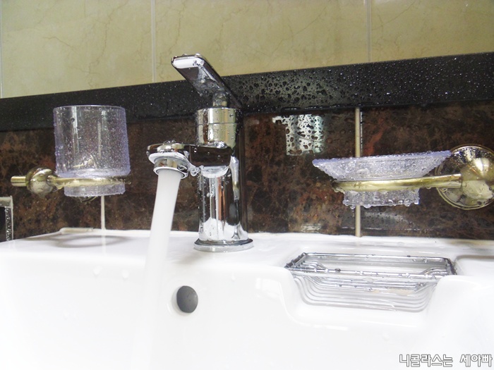 깔끔해 보이는 원홀 수전으로 설치하고, 컵대, 비누대를 좌우로 시공합니다.