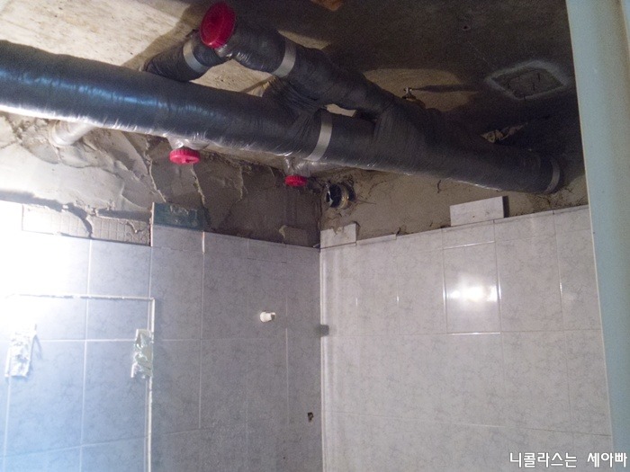 하지만 기존 욕실 온냉수 배관은 조금 낮고, 폭도 넓어 이렇게 배관공사를 해 주어야 합니다.