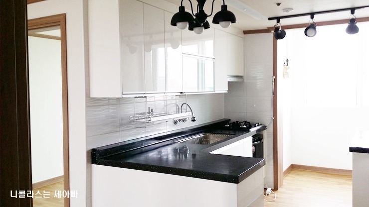 조명은 주방 조명을 천정에 매립시키고, 식탁 자리에는 펜던트 조명으로 포인트를 줬습니다. 그리고 뒷베란다 확장을 했는데 주방과 뒷베란다를 커버할 수 있게 레일 조명을 설치했습니다.
