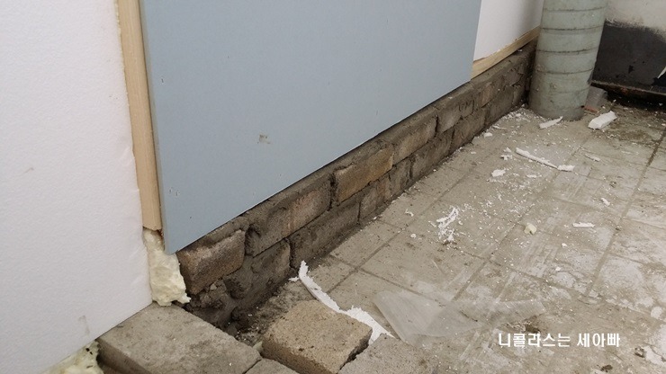 뒷베란다 확장하면서 세탁기가 놓일 자리에는 물을 많이 사용하기 때문에 전체 벽면 상단부는 방수 석고보드로 마감하고 하단부는 벽돌 시공하였습니다.그러고 나서 바닥은 타일을 시공하고요.