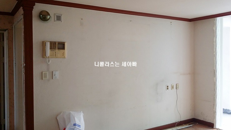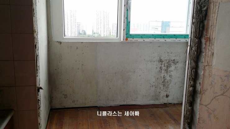 주방이 좁아 뒷베란다를 확장해 같이 사용하게끔 공사를 하였습니다. 우선 벽틀을 철거하고요.
