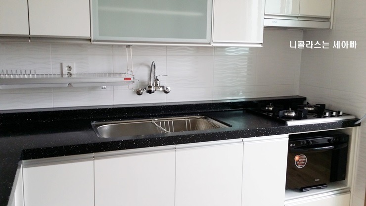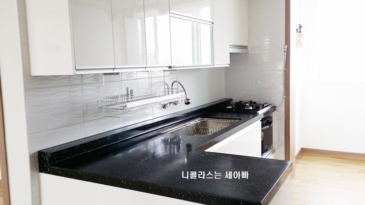 상하부장은 UV하이그로시 제품으로 매립형 손잡이를 달았습니다. 그리고 상판은 삼성 제품의 인조대리석으로 시공하고요.