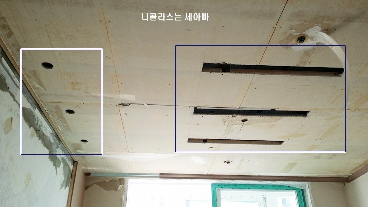 거실 아트월 자리에는 LED 매립형으로 간접 조명을 주기 위해 천정을 타공 한 모습입니다.