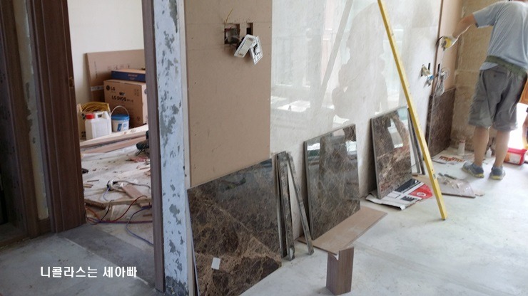 그리고 밋밋하게 대리석을 시공하기보다는 입체감을 주기 위해 이렇게 목공틀 작업을 하였습니다.