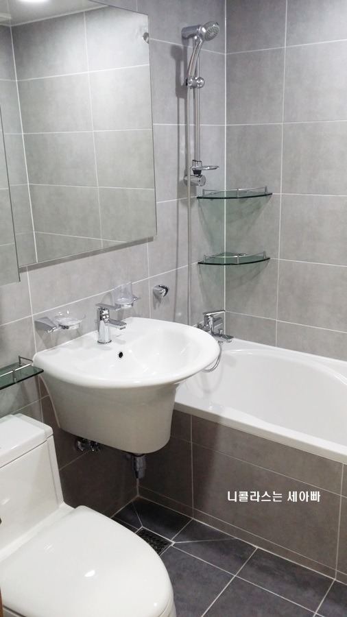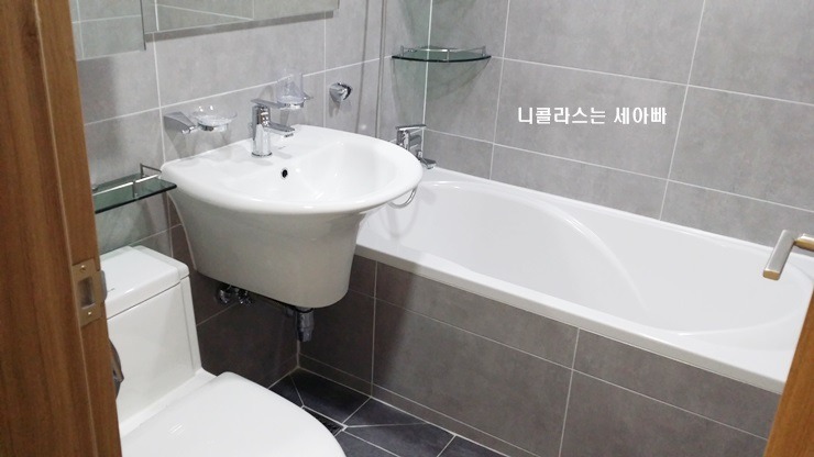 욕조도 새롭게 설치했습니다. 그리고 욕조 하단부에는 조적공사를 하고 타일을 붙였습니다. 이렇게 하면 욕조가 매립된 느낌이 들면서 깔끔하고 고급스럽습니다. 또 튼튼하고요.