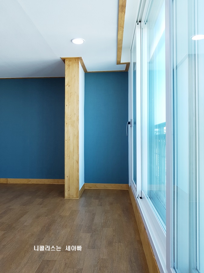 주방 전기오븐은 외국에서 사용하던 제품을 따로 놓으신다고 하시네요. 뒷베란다 중문은 로열블루 칼라로 포인트를 줬습니다.