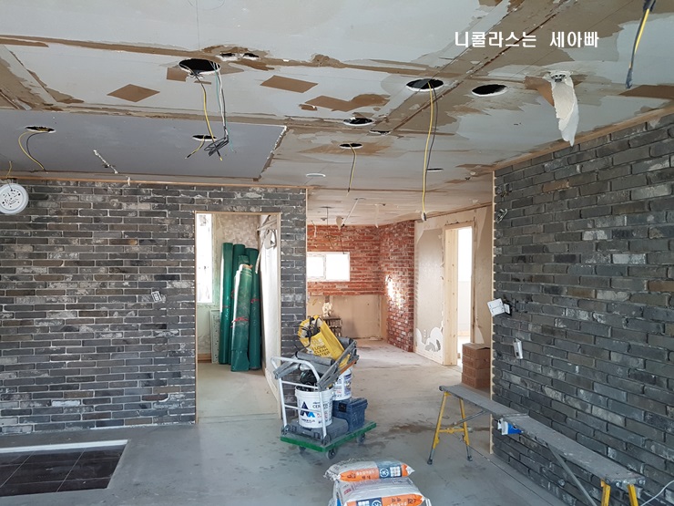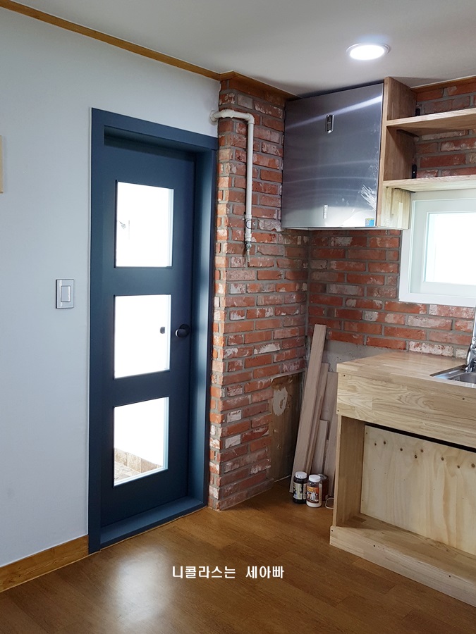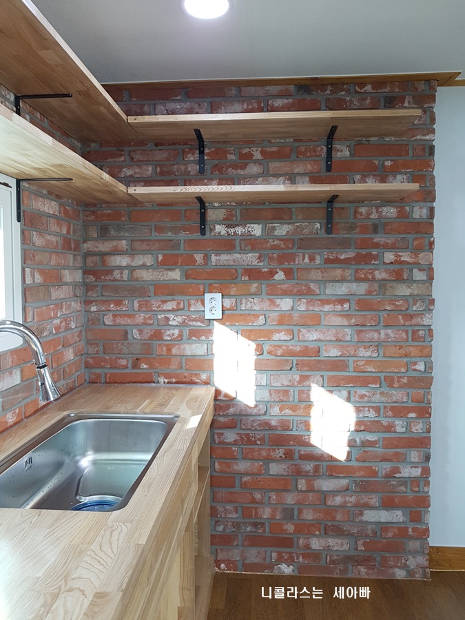주방 벽은 일반적으로 타일을 시공하는데요. 이 현장은 고벽돌로 시공했습니다. 그리고 싱크대는 기성품이 아닌 원목으로 직접 제작해서 설치할 예정입니다.