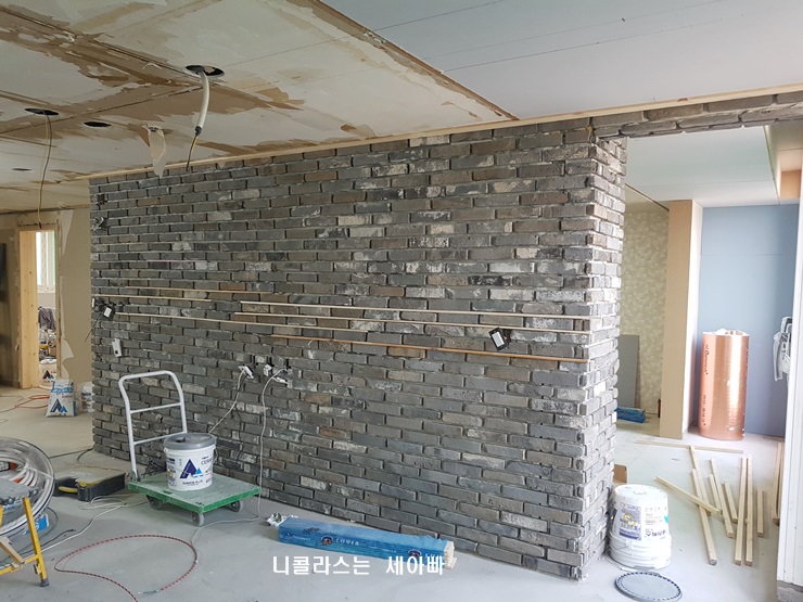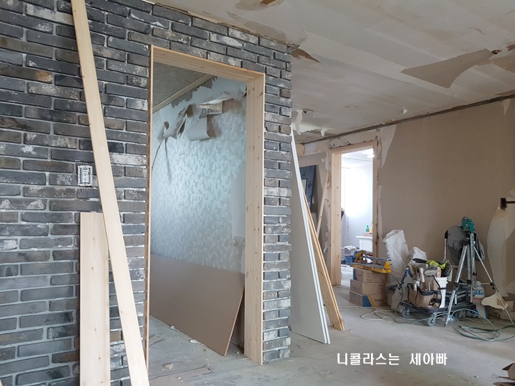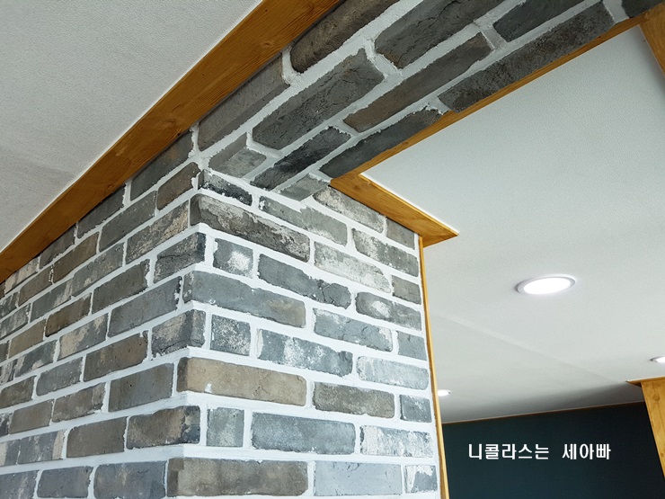 원목으로 방문틀을 제작하고 나서 청고 벽돌을 시공했는데요. 고벽돌이나 청고 벽돌은 아파트 인테리어를 할 때 가성비가 좋은 제품인 것 같습니다.