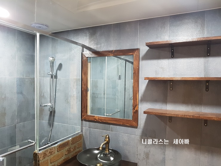 이 욕실은 세면기 하부장, 거울, 선반 등을 맞춤 제작하고 세면기 볼 및 수전도 어렵고 구입한 제품으로 시공했습니다. 나름 고생한 만큼 욕실이 잘 나와줘서 한편으로는 뿌듯하기도 합니다.