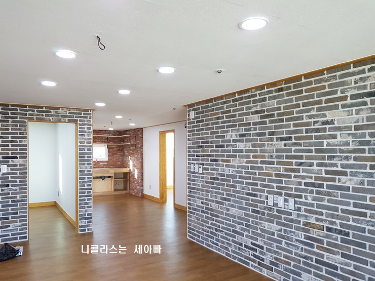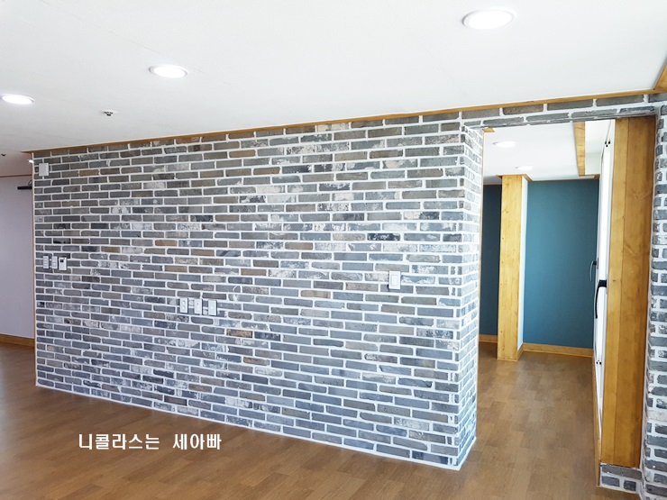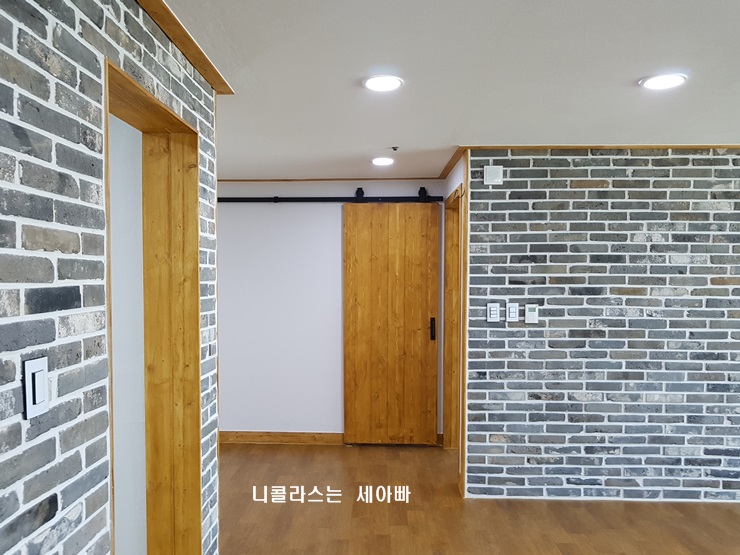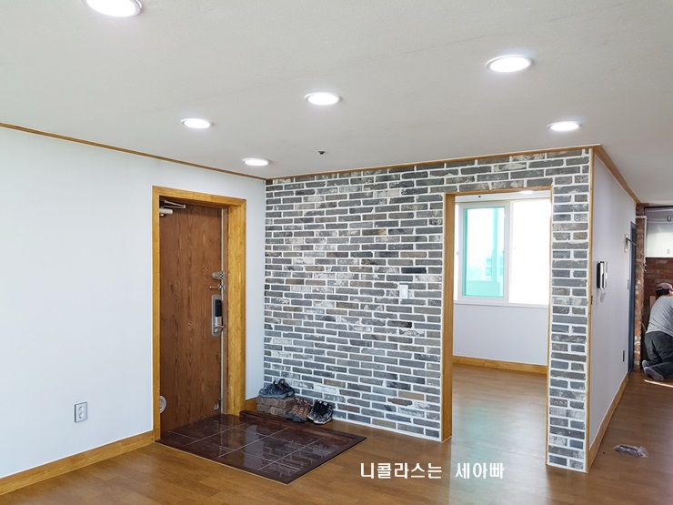 그리고 신발장도 따로 설치하지 않기를 원하셔서 이렇게 기존 신발장 자리에는 청고벽돌로 마무리했습니다.