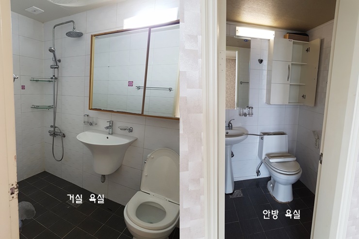 거실 욕실 리모델링이 완성된 모습인데요. 주변에서 흔히 볼 수 없는 욕실 분위기가 느껴지는데요.