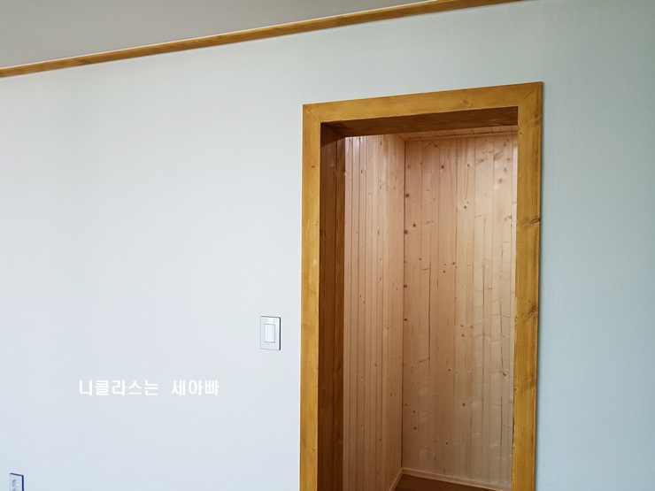 안방 욕실인데요. 따로 욕실로 쓰지 않고 옷 등을 수납할 수 있는 공간으로 요구하셔서 이렇게 원목으로 마감했습니다.