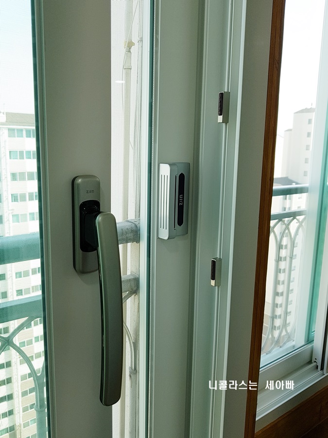 앞 베란다 샤시에 설치된 자동 손잡이입니다. 닫으면 자동으로 문이 잠겨서 좋습니다.