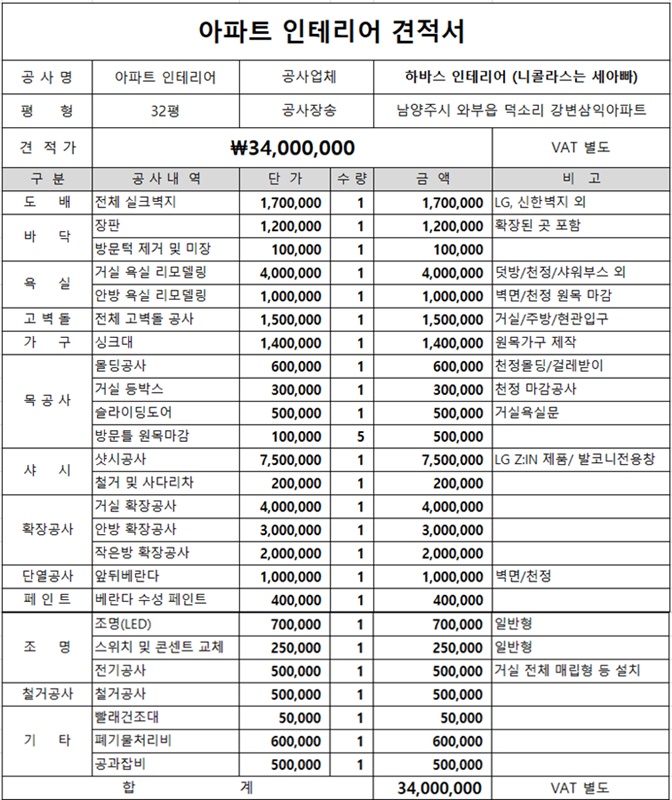 ▷ 우선 아파트 인테리어 세부 비용을 살펴보면.....