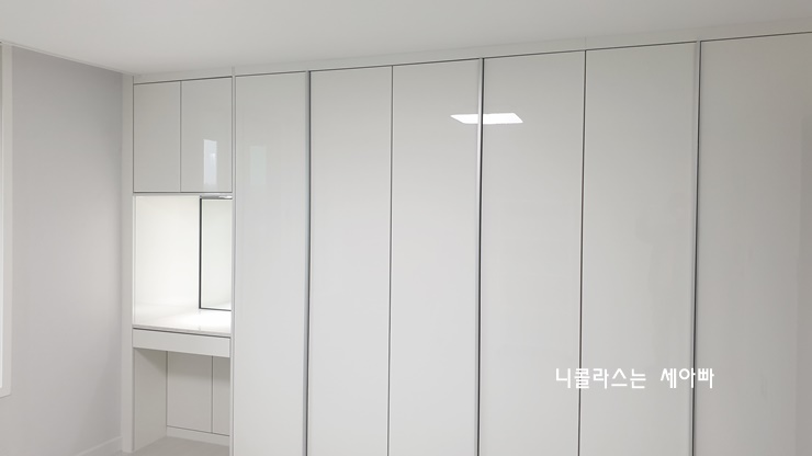 그리고 붙박이장을 설치하면서 화장대 공간을 만들어 드렸는데요.