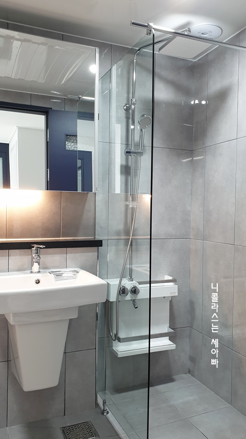 그리고 상단부는 아쿠아 유리를 넣어 욕실 안에 사람이 있는지 똑똑 노크할 필요는 없겠지요.