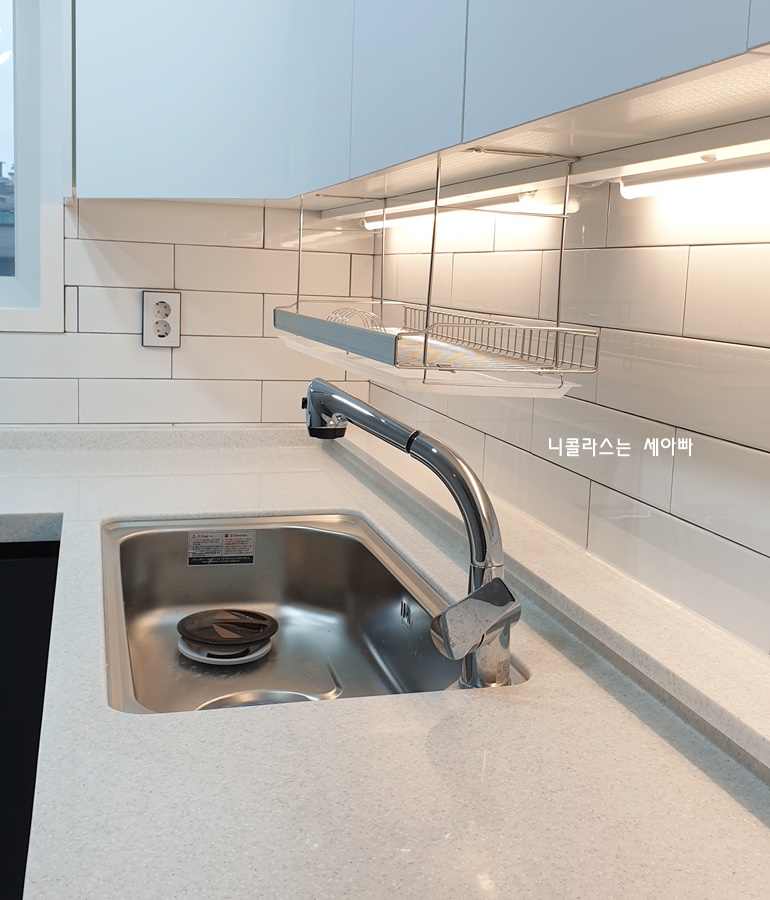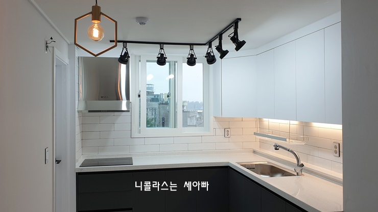 레일 조명과 싱크대 상부장 하단에 간접조명을 설치하니까 주방 분위기가 한층 더 업그레이드된 것 같습니다.