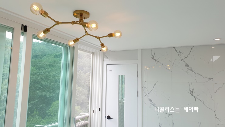 거실 확장된 곳에 포인트로 펜던트 조명도 설치하고요.