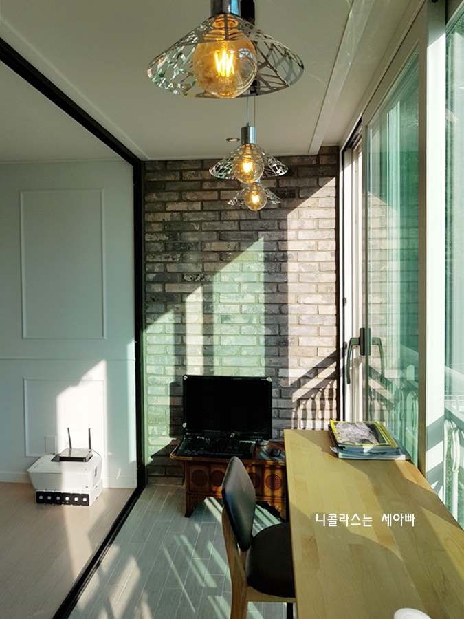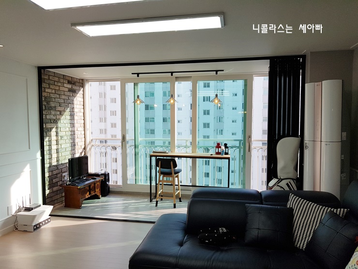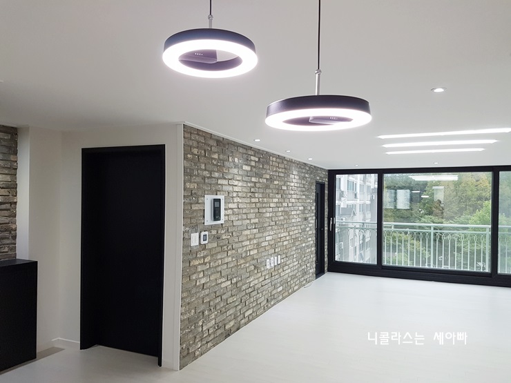이 현장은 금천구 벽산 5단지 32평형 아파트인데요. 거실은 확장하지 않으면서 벽면은 웨인스코팅 작업을 하고 거실 내부 샷시 대신 폴딩도어를 설치했습니다. 그리고 앞 베란다 벽면에 청고 벽돌 및 펜던트 조명으로 포인트를 줬습니다.