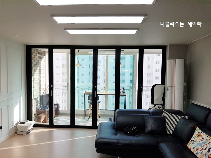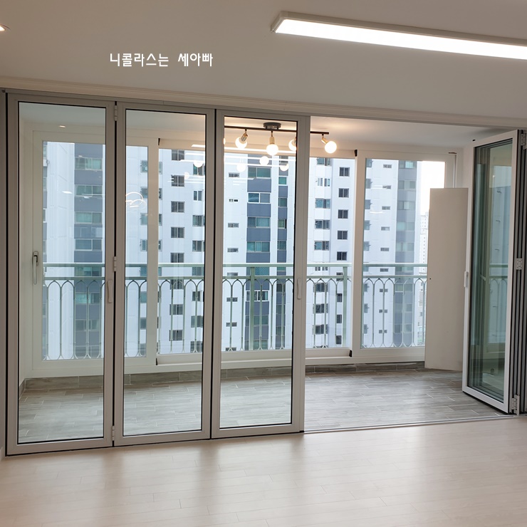 폴딩도어는 샤시와 비교해 외풍이나 소음을 차단하는 효과가 조금은 떨어지는 편인데요. 그래서 거실 확장공사를 하면서 바닥 난방을 깔고 베란다 샷시는 이중창(비용이 부담될 때는 단창으로도 시공함)으로 설치해 기본적인 외풍을 막고 폴딩도어를 설치합니다.