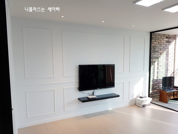 웨인스코팅 작업은 거실 아트월 벽면 전체와 나머지 거실 벽면은 하단부만 시공했습니다. 그리고 현관 입구 쪽 벽면도 웨인스코팅 작업을 했습니다.