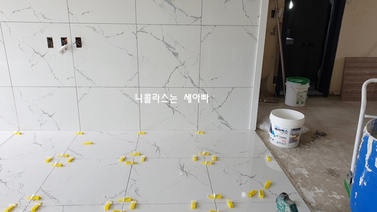 폴리싱 타일을 시공하는 모습인데요. 큰 타일을 시공하다 보면 어떤 곳은 높고 어떤 곳은 낮게 시공되어 문제가 생길 수 있는데요. 저렇게 평탄 클립을 이용해 시공하면 타일 단차를 획기적으로 줄일 수 있어 좋습니다.