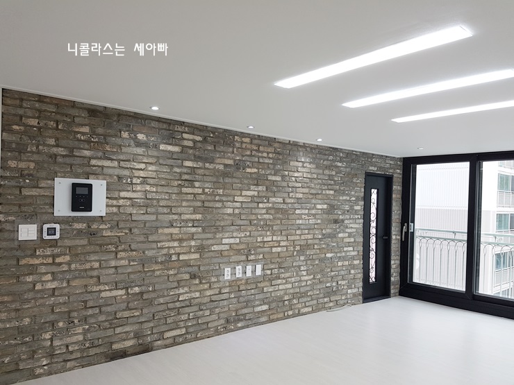 42평형 아파트 거실을 확장하면서 거실 아트월을 청고벽돌 타일로 시공한 현장인데요. 청고벽돌 또는 고벽돌 타일은 거실 인테리어를 할 때 가성비 좋은 자재로 카페 같은 분위기를 연출하는 데는 그만인 것 같습니다.
