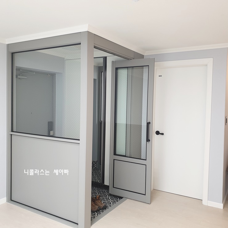 현관 중문을 ㄱ자형으로 설치했는데요. 보통은 3 연동 도어를 설치하는데요. 이 현장은 슬라이딩 도어로 설치했습니다.