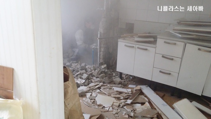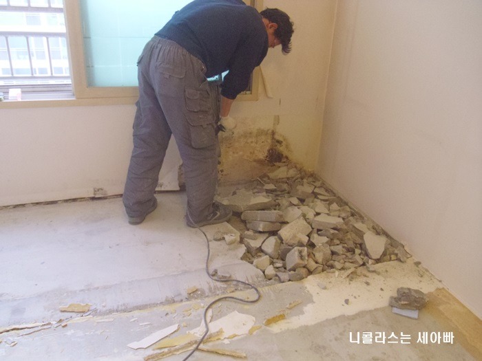 확장된 부분에 난방배관을 깔기 위해 바닥을 철거하고 있는 중입니다.