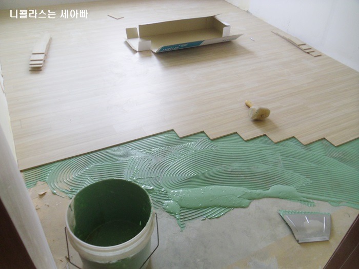 이렇게 본드 접착제를 바닥에 발라 온돌마루를 시공하는데요.