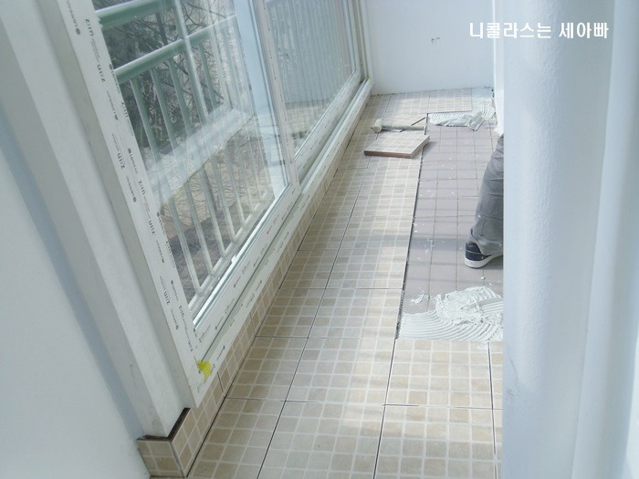 베란다 타일, 주방 타일 및 현관 타일은 거의 대부분 이렇게 덧방 시공(기존 타일 위에 덧붙이는 방식)하게 됩니다.