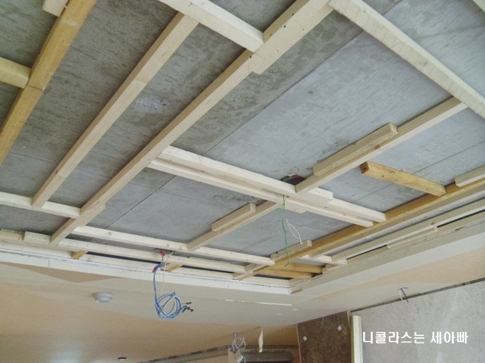 실링팬을 설치하기 위해서 목공작업과 전기배선 작업을 진행하고 있는 사진입니다.