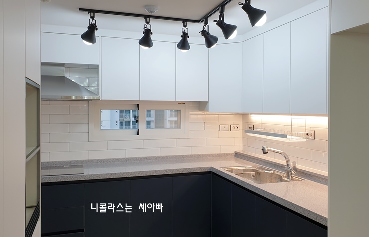 3. 조명은 이쁜 식탁 펜던트, 레일 조명을 설치하고 상부장 하단부에 간접조명을 서비스로 시공해 드렸습니다.
