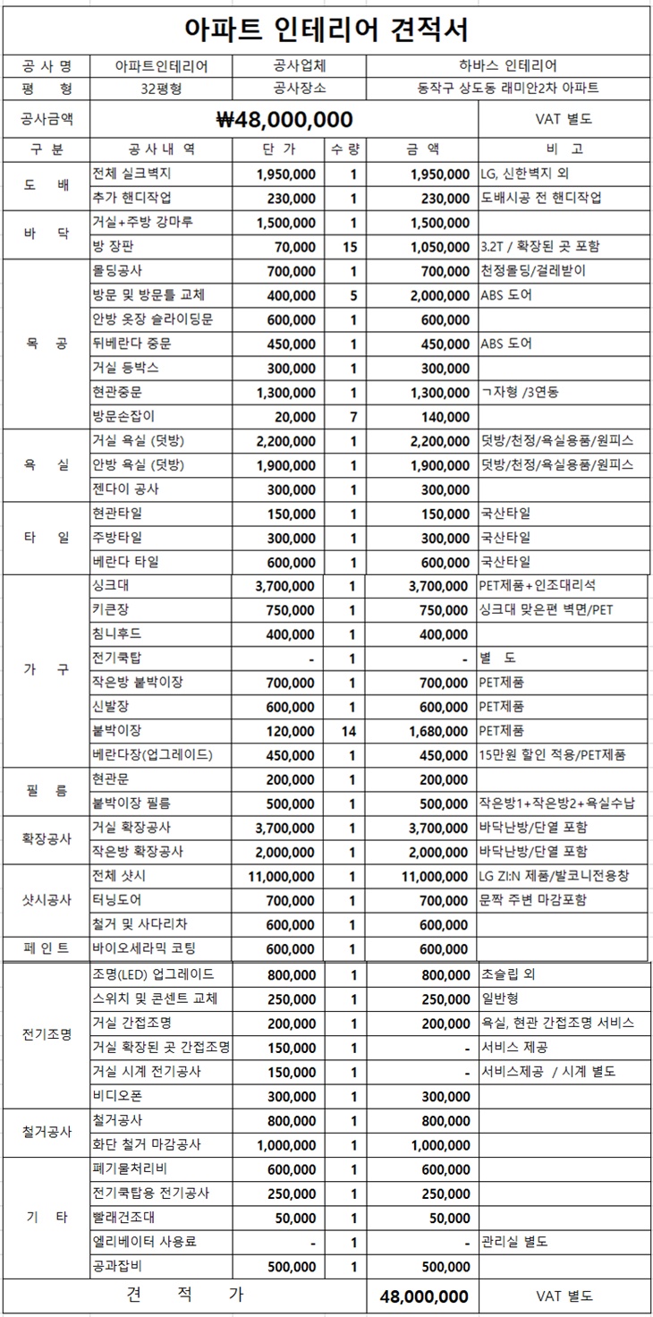 ▷ 그럼... 상도동 래미안 2차 아파트 리모델링 견적서부터 살펴볼까요~~~