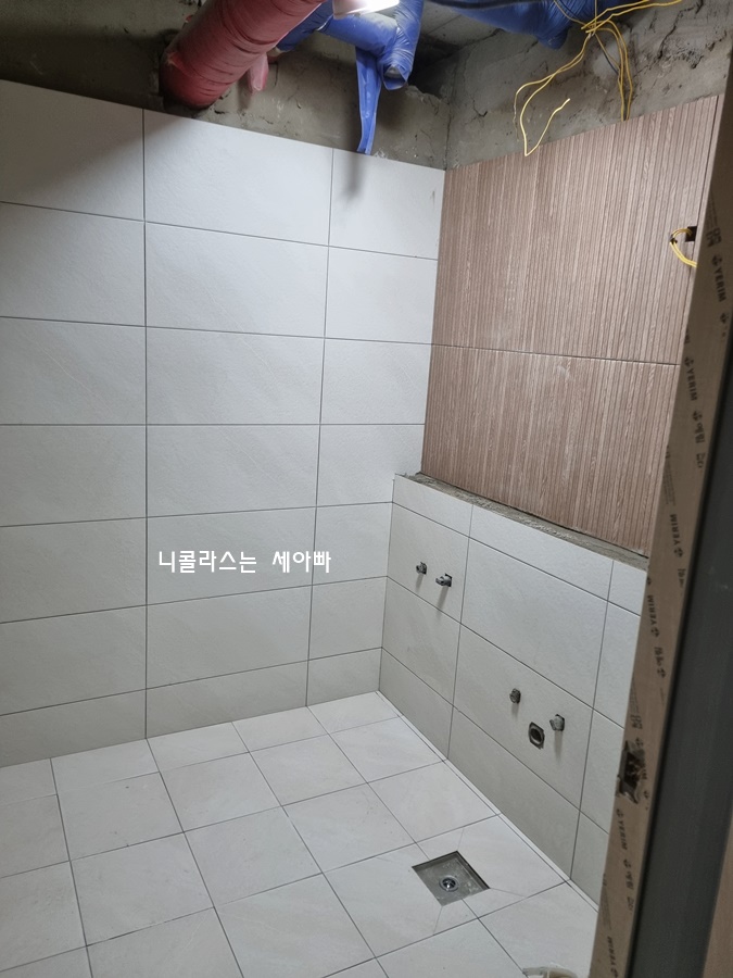 벽면에는 300×600, 바닥에는 300×300 논슬립 타일로 시공했습니다.