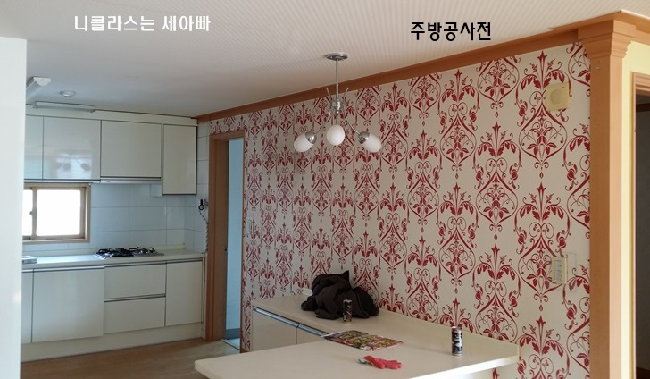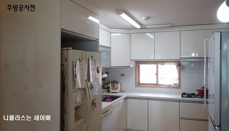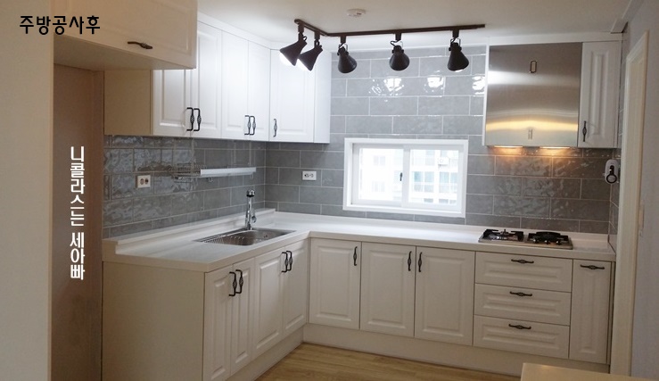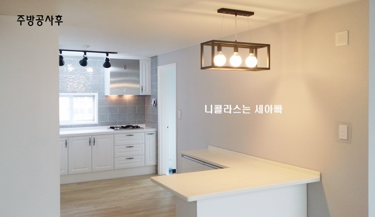 주방은 기존 ㄱ자형 싱크대를 철거하고 PET 무광 싱크대로 교체했습니다.
