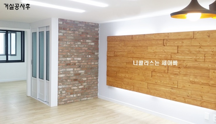 - 거실 아트월: 원목 시공 + 오일 스테인 마감