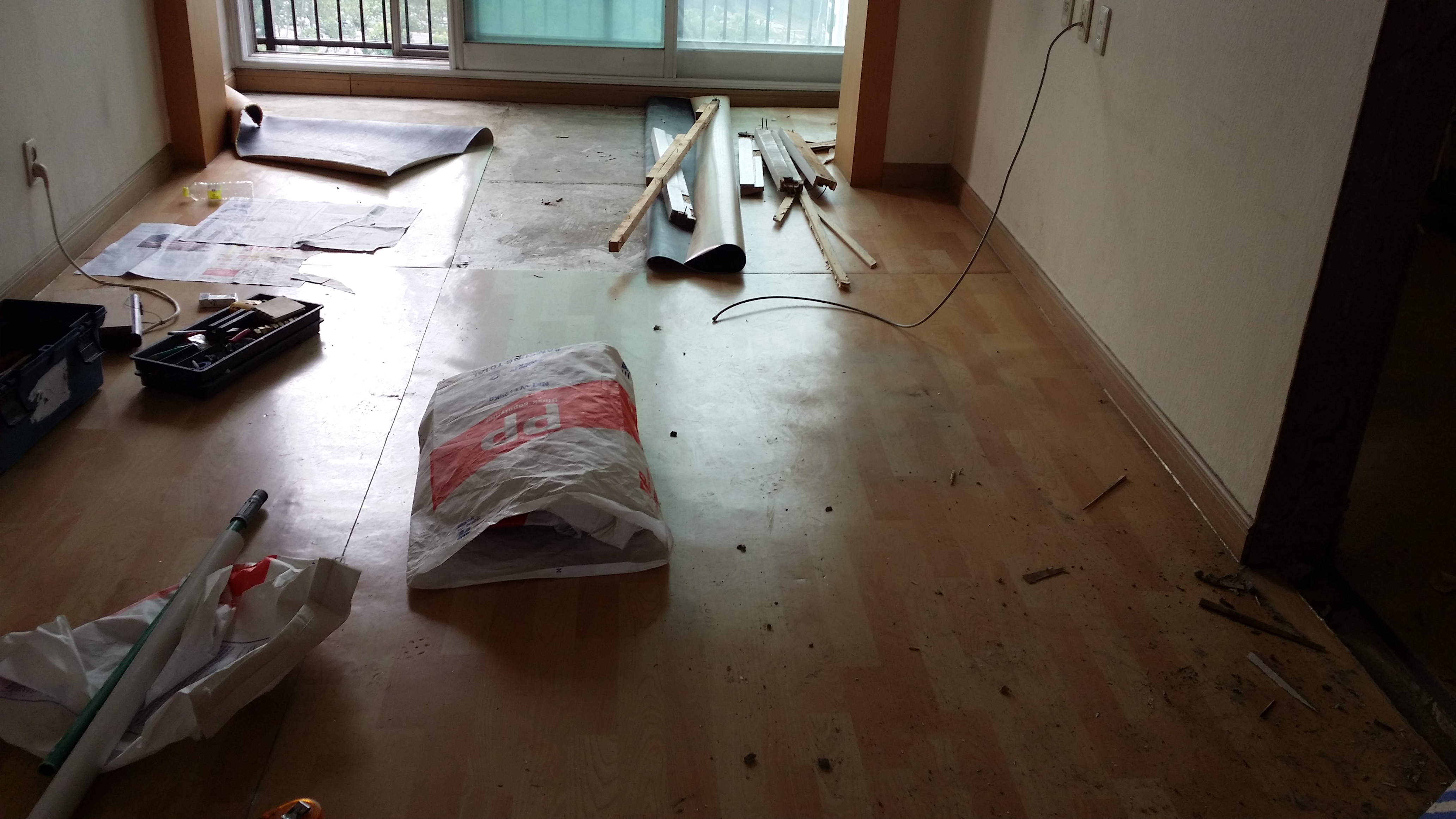 사진 속 모습은 거실 리모델링 초기에 진행한 핵심 공정들입니다.