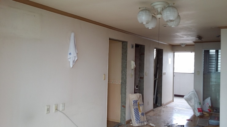 이 사진은 주방과 거실 사이의 비내력벽을 철거하는 모습입니다.